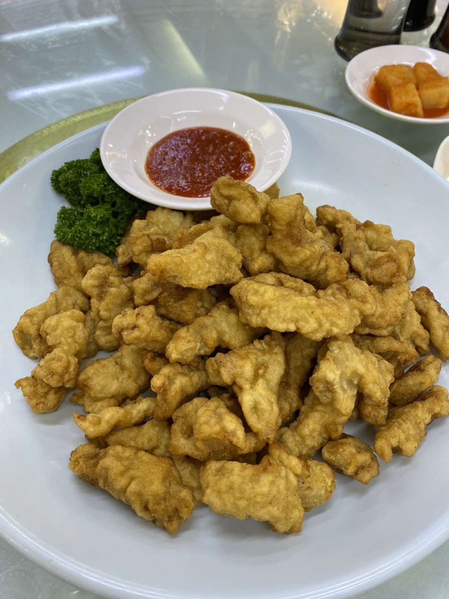 군만두는 피가 두껍고 생각보다 속이 적어 실망하면서 맛을 보았는데 제 생각과 전혀 다른 맛을 내 많이 놀라웠습니다. 피가 두꺼운 건 맞으나 의미없이 두꺼운 것이 아니라 최상의 쫄깃함을 내기위한 피 두께였으며 속은 충분한 향을 갖고 있고 피와 조화가 굉장히 좋았습니다. 간이 잘 되어 있어 , 소스 없이 군만두만 먹어도 맛이 훌륭했지만, 군만두의 풍미랑 최상으로 끌어올리는 건 소금이였습니다. 사실 고기튀김을 먹고 나서 이건 소스보단 소금에 찍어먹는 것이 훨씬 훌륭하겠다는 생각이 들어, 소금을 요청드렸고 군만두도 소금에 한 번 찍어먹어봤는데 정말 군만두의 숨어있는 풍미까지 끌어올려주는 효과가 있었습니다. 방문하셔서 군만두를 드실 때, 꼭 소금을 요청하여 찍어먹어보시길 바라겠습니다. 고기튀김은 가히 제가 먹은 중식 요리 중 최고가 아닐까 싶었습니다. 크게 유별난 맛은 없으나, 정말 잘튀겨진 튀김옷과 돼지고기의 냄새가 아닌 향기를 품고있는 돼지고기의 조화가 정말 놀라웠습니다. 정말 놀라운 건, 돼지고기를 튀겼는데도 접시를 비우는 순간까지 전혀 느끼함이 없었다는 것입니다. 돼지고기가 지방이 없는 부위여서 느끼함이 없었던 것일까라고 생각했는데, 가만보니 고기튀김이 담겨져 있던 접시에 거의 기름이 묻어있지 않았습니다. 즉, 정말 튀기는 기술이 훌륭하다고 말씀드릴 수 있을 거 같습니다. 군만두와 고기튀김을 생각만해도 김치가 땡기시는 분들이 많으실텐데, 김치가 그렇게 많이 생각나지 않을 정도로 깔끔하게 튀겨진 요리 였습니다. 고기튀김 또한 마찬가지로 소금에 찍어 먹었을 때, 풍미가 극도로 올라가는 점 꼭 참고하시길 바라겠습니다.