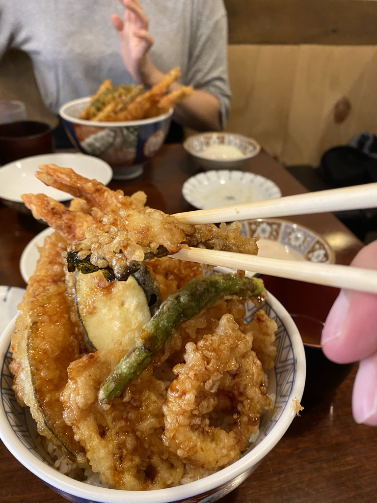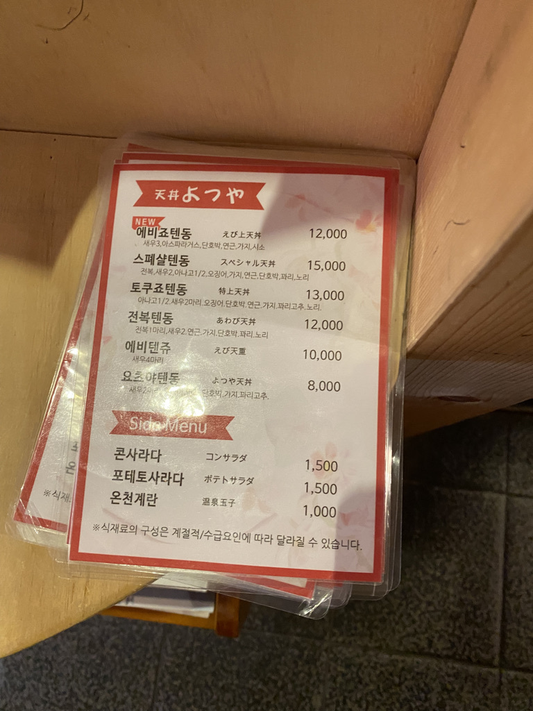 제가 주문한 메뉴는 요츠야 텐동이였습니다. 첫 한입은 굉장히 훌륭한 맛이 났으며, 튀김옷이 굉장히 잘 튀겨져 튀김옷의 바삭한 식감과 식재료의 식감 조합 또한 매우 훌륭했습니다. 하지만 이 간장베이스의 튀김은 먹으면 먹을 수록 살짝 물릴 정도로 간이 쎄다고 느껴 졌습니다. 입맛이 점점 슴슴한 맛을 많이 찾는 편으로 변하고 있는 것도 영향이 있겠다고 할 수 있지만, 제 입에는 너무 간이 쎄 3번 째 입부터는 물린다는 느낌을 지울 수 없었습니다. 게다가 점심 시간에 방문하여 느끼함을 씻기위한 맥주를 주문하기도 좀 그래서 결국 텐동만 먹었는데, 다 먹었을 때 유쾌한 기분은 아니긴 했습니다. 그리고 이 양념의 맛이 굉장히 익숙해서 곰곰히 생각해보니 교촌 허니 시리즈의 맛과 굉장히 유사하다는 걸 알 수 있었습니다. 교촌 허니 시리즈 또한 첫 조각은 정말 극락의 맛을 선사하지만 뒤에가면 조금씩 물리는 걸 느낄 수 있었는데 이 텐동은 교촌 허니시리즈 보다 조금 더 빨리 물리긴 했습니다. 소스의 양 조절이 가능하다면 저는 조금 적게 넣어서 먹지 않을까 싶습니다. 그래도 사람들이 많이 찾는 이유는 분명 있었던 집이였습니다.