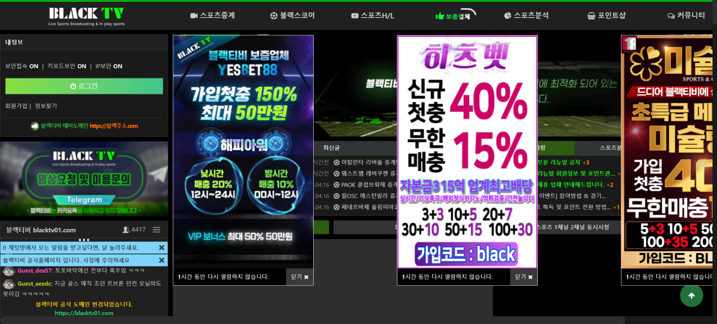 스포티비가 유료화 되면서 많은 사람들이 넘어와 해외축구를 보는 사이트 입니다. 블랙티비는 Youtube의 API를 따서 만들어진 사이트라고 하니 블랙티비도 꼭 한 번 이용해보세요.